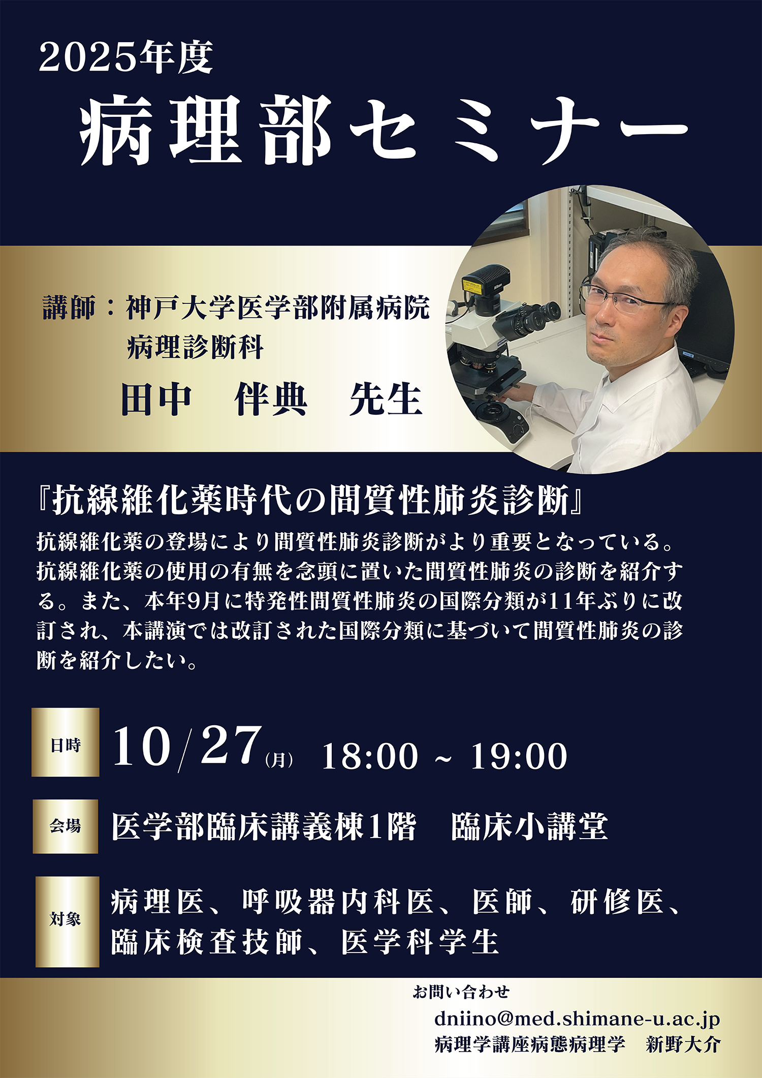 10月27日(月)18:00〜19:00神戸大学医学部附属病院病理診断科田中伴典先生をお招きしてセミナーを開催します。